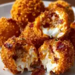 Deliciously satisfying Buffalo Chicken Bacon Mozzarella Bombs that combine crispy fried goodness with tender chicken, smoky bacon, and gooey mozzarella cheese.