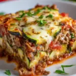 A comforting casserole featuring layers of zucchini, ground meat, marinara sauce, and gooey cheese, perfect for satisfying pizza cravings without the guilt.