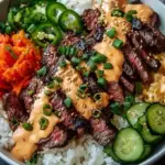 Delight in these Korean BBQ steak rice bowls, packed with marinated beef, fluffy rice, and colorful vegetables, topped with a creamy, spicy sauce.