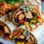 - Assemble the Wraps: Fill each tortilla with rice, chicken mixture, black beans, corn, and cotija cheese.