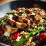 Grilled lemon herb chicken isn’t just a meal; it’s a memory in the making. Each bite offers a delightful juxtaposition of bright acidity from the lemon and the rich savoriness of the herbs. The juiciness of the chicken plays beautifully against the hint of smokiness imparted by the grill, crafting a profile that’s irresistible for all palates. The accompanying quinoa salad bursts with texture and freshness, while the asparagus lends a delightful crunch that brings balance to the plate.
