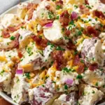 Picture this: a chilled bowl of soft yet firm potato cubes, draped in a luscious blend of mayonnaise and sour cream, with a vibrant pop of diced dill pickles to awaken your taste buds. Every bite resonates with the smoky richness of crispy bacon, while sharp hints of red onion and cheese elevate the experience to greater heights. There’s a fulfilling crunch from the fresh herbs sprinkled throughout, drawing you back in for just one more forkful. This isn’t your average potato salad; each ingredient dances in harmony, offering a culinary experience that warms the soul.