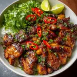Each bite of this dish is a tender embrace of juicy chicken thighs, marinated with the bold essence of lemongrass, lively garlic, and a symphony of savory sauces. Picture the vivid golden hue of the chicken, glistening under a hot pan and resonating with caramelized notes that hint at a delightful umami infusion. The texture is succulent yet slightly crispy around the edges, providing a satisfying crunch that harmonizes beautifully with the flakiness of jasmine rice or the chewiness of vermicelli noodles. As you take a bite, a burst of herbaceous freshness from the garnishes of cilantro and lime wedges dances on your tongue, inviting you to savor each morsel longer.